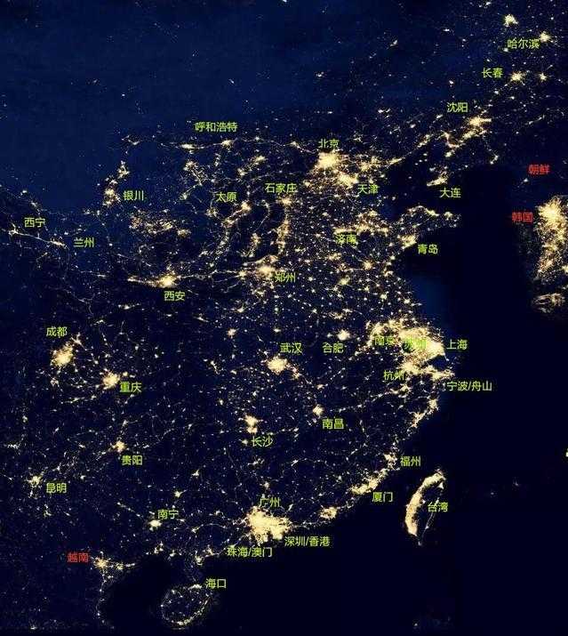 从卫星夜视图我们可以看到,在我国西部地区,有三大区域夜晚灯光最亮、最集中、范围最大,分别是四川成都、重庆和陕西西安及周边区域。